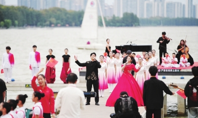 武汉晚报讯(记者晋晓慧 通讯员何宇炀 高梦雅)“我和我的祖国,一刻也不能分割……”10月1日晨,伴随着从东方升起的太阳,东湖畔的凌波门栈桥上歌声响起,日出歌会正式上演。