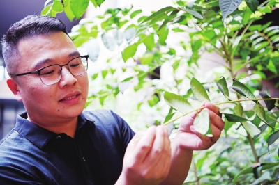 9月25日,郑勇在天津工大的校园内查看自己种植的漆树。