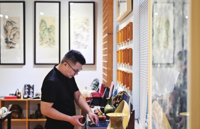 9月29日,郑勇在工作室内整理陶胎漆器。