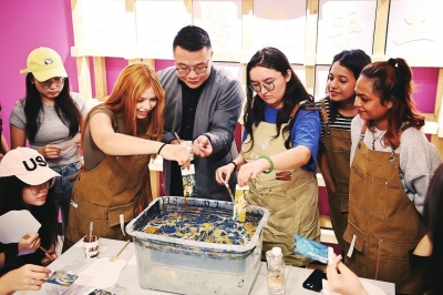 9月28日,郑勇(中)在课堂上指导中外学生体验漂流漆技法。