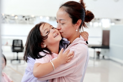 在塞浦路斯利马索尔港,一名从黎巴嫩撤离的小女孩与妈妈玩耍。