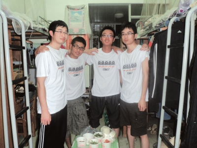2013年毕业,罗锋(左三)和室友穿着扎西南美(左二)送的印着“五头牦牛”图案的文化衫。