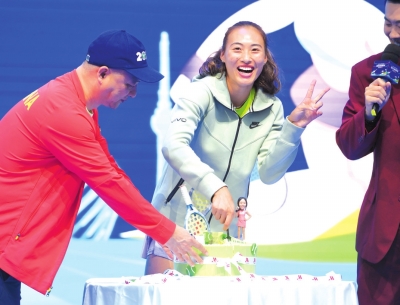 10月8日下午5:40,武汉网球公开赛场外“大看台”举行郑钦文生日会,众多球迷分享快乐。