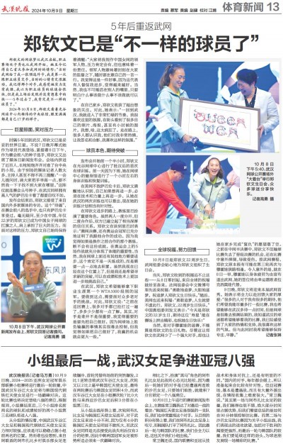 9日晚,郑钦文将迎来本届武网首秀。她表示将全力以赴回馈大家的厚爱:“很多的人对于我有很多的期待,他们希望我能尽量多打一些比赛,我也希望能够在武汉多待一点时间,但是网球是很难去预测结果的,我知道武汉的球迷都希望能够看我的比赛,我已经感受到了大家的热情和支持,我很喜欢这样的气氛。但与此同时我希望能够保持专注、平静。”