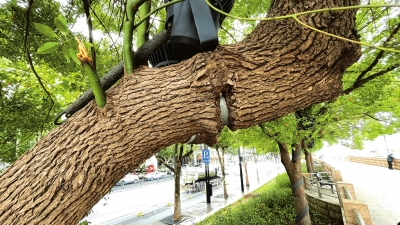 探访中,记者发现部分枝干上有调整痕迹——金属固定圈挪了挪位置,但调整之前的环形伤口依然清晰可见。