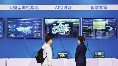 在新疆国际会展中心举行的新疆数字丝路博览会现场,参观者在了解5G通信技术。(资料图片)