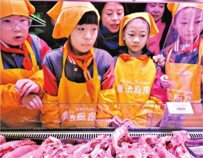 在这家“双汇冷鲜肉”猪肉铺前,四年级女生李靖雯指着柜台里的肉,熟练地给同学们介绍猪肉的不同类型:“这是里脊肉,是猪的脊柱骨外面的一整条肉,全是瘦肉。这是五花肉,肥瘦相间,做出来的粉蒸肉可好吃了……”这家小小的猪肉铺就是李靖雯爸爸妈妈开的。当天,在李靖雯妈妈的指导下,同学们不光认识了里脊肉、五花肉、梅花肉、腿肉等,知道了不同类型的肉适合哪种烹饪方式,还拿起了火枪、菜刀,尝试了去除猪毛、切肉、称肉等工作。猪肉铺有了小小售货员,吸引了不少来往的顾客。刘薇薇用刚学的“一看二按三摸四闻”的方法帮老爷爷挑肉,收获了老人的大拇指点赞。课后,同学们还在菜场的不同摊位上找到了猪肉的“好朋友”——萝卜适合炖肉、菜薹适合炒腊肉、莲藕可以拿来做排骨藕汤。