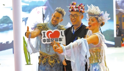 近日,2024中国国际旅游交易会在国家会展中心(上海)开幕。一位参观者(中)在中国旅游集团展台与工作人员合影。