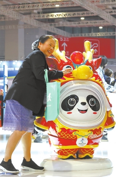 11月22日,参观者在中国旅游集团展台上与龙年主题装扮的冰墩墩玩偶合影。