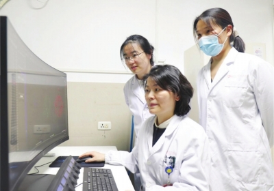 武汉市第一医院皮肤科主任陈柳青(中)使用激光共聚焦荧光显微镜指导团队做实验。