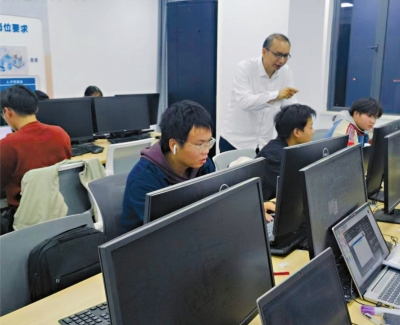 欧阳才校(穿白衬衣者)辅导学生参加蓝桥杯竞赛。