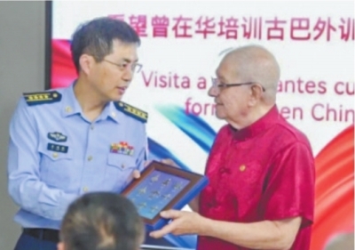 李鸿鹏大校向古巴老飞行员转达中国老教员信函,并赠送中国空军纪念品。