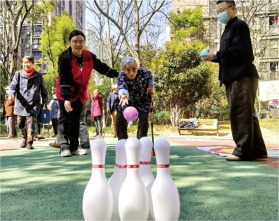 社工陪老人玩“欢乐保龄球”。