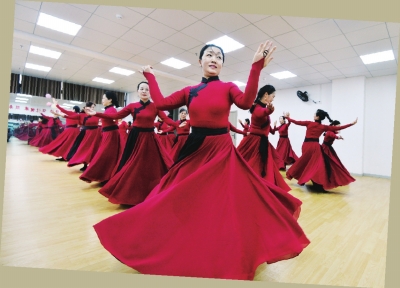 老年大学里热爱文艺的社区阿姨们正在排练舞蹈。