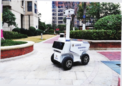 智慧安防机器人在小区内巡逻。