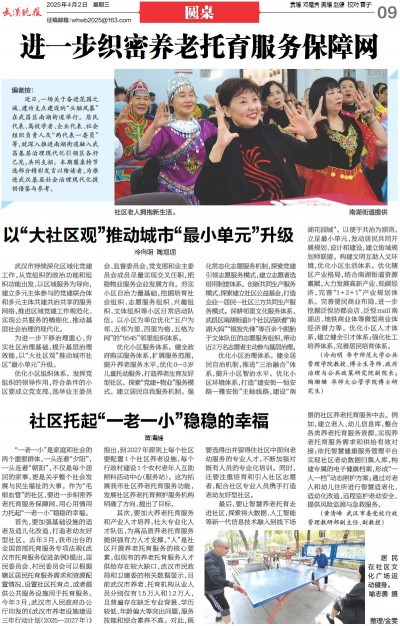 首先,要加强基础设施的适老及适儿化改造,打造老幼友好型社区。去年3月,我市出台的全国首部托育服务专项法规《武汉市托育服务促进条例》提出,居民委员会、村民委员会可以根据辖区居民托育服务需求和资源配置情况,设置社区托育点,或者提供公共服务设施用于托育服务。今年3月,武汉市人民政府办公厅印发的《武汉市养老设施建设三年行动计划(2025—2027年)》指出,到2027年原则上每个社区要配置1个社区养老设施,每个行政村建设1个农村老年人互助照料活动中心(服务站)。这为拓展我市社区养老托育服务功能,发展社区养老托育照护服务机构明确了方向、提出了目标。