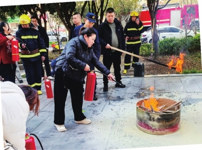 社区居民和商业街业主学习消防灭火。