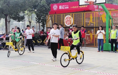 社区邻里运动会进行自行车慢骑比赛促进邻里和谐。