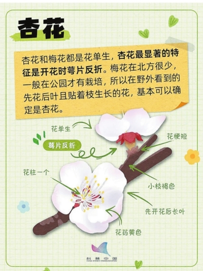 杏花萼片反折,梅花萼片平展;杏花枝条红褐色,梅花枝条绿色。