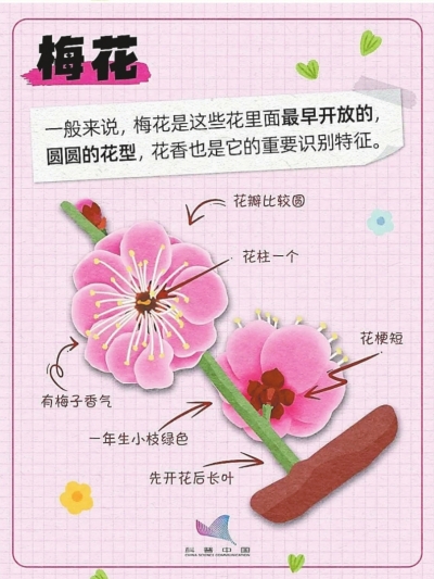 花期差异:一般而言,开花时间梅花最早(3月中旬之前),杏花紧随其后(3月底),而梨花、桃花、樱花、李花集中于3—4月。