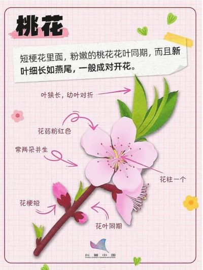 叶片形态:桃花叶细长如燕尾,杏花叶宽圆带尾尖,樱花叶缘有重锯齿。
