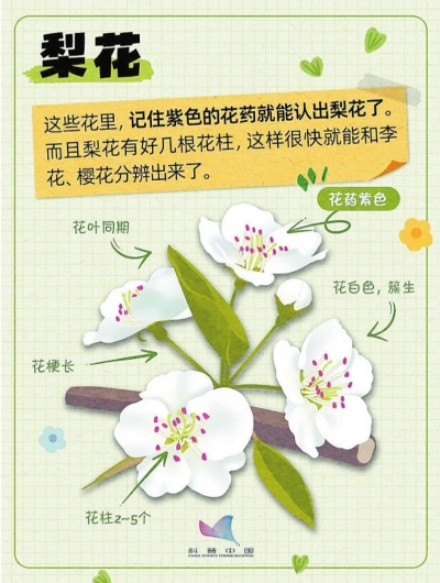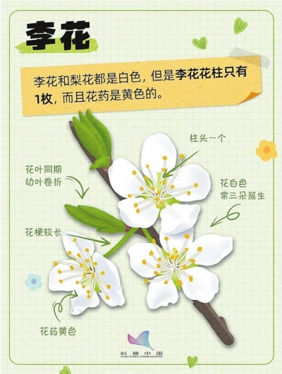 梨花花朵更大(直径2—4厘米),花药紫色;李花仅1—2厘米,花药黄色。