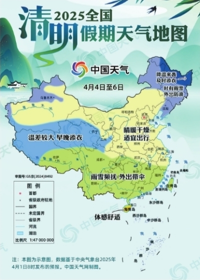 今年清明假期,我国南北方天气大不同,总体呈现北方晴暖干燥、南方雨雪频扰的格局,大部地区气温较常年同期偏高,多地昼暖夜凉。其中,4日至5日北方地区有大风降温,需注意防风防火;4日至6日,贵州东部、湖南南部、广西北部等地局地有大雨,出行需注意防滑。