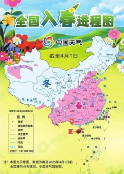 从该图来看,截至4月1日,春季的最北端已经抵达河北北部、山西南部、陕西中部一带,西北地区大部、东北大部以及西藏等地仍处在冬季。