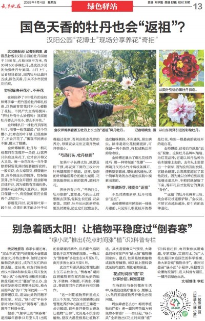 “‘返祖’的牡丹花凋谢以后,我会将花枝连根铲除。”金权说,不然它会越长越壮,使引进的品种退化。