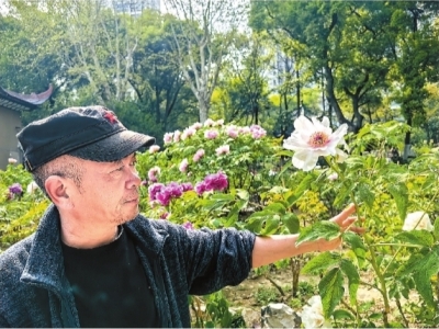 在该园养了8年牡丹的金权师傅手拿一把竹签给牡丹绑扎枝条,以防游客赏花时不小心碰断了花枝。市民严先生当场提问:“养牡丹有什么妙招吗?我家的牡丹要么开花小,要么不开花。”