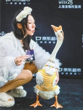 灯光璀璨的T台上,模特儿鱼贯而出,但主角不是俊男靓女,而是他们手里牵着的“汪星人”“喵星人”,还有“卡皮巴拉”“大鹅”等宠物。这些萌宠身着最新发布的时髦新衣,或一脸傲娇地卡点走步,或憨态可掬地东张西望。
