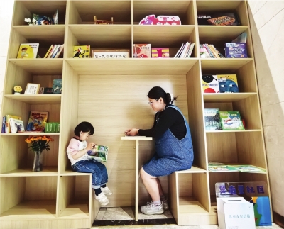 鸿达中央广场小区楼栋里的读书角,书架上刚上新的书还没有填满,一位母亲就带着孩子体验造型独特的书桌。
