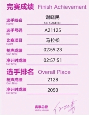 最近进入马拉松旺季,跑友圈里热传一张马拉松完赛证书——全程马拉松,枪声成绩2小时59分23秒,净成绩2小时57分51秒,排名65岁以上年龄段第一,这是70岁的浙江衢州爷爷谢晓民在无锡马拉松的成绩。