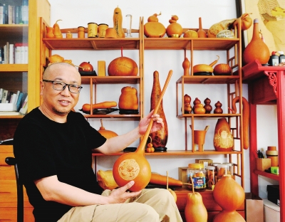 王一民在把玩他的一个长相奇特的油锤葫芦。