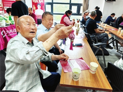 活动现场,长桌上摆放着艾叶、薄荷、陈皮等药材和捣药罐、捣药锤及各式香包袋等工具物料。九州上医馆工作人员一边讲解,一边示范香包制作过程。不一会儿,整个活动室就充满了“咚咚咚咚”的捶打声,随后一个个精致小巧的香包便诞生了。