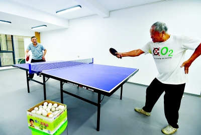 居民在乒乓球室里打球健身。