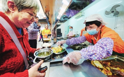 在广州市荔湾区金花街长者食堂,工作人员为前来堂食的老人选餐配餐。(资料照片)