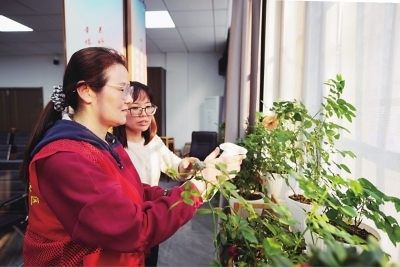 工作人员为社区绿色驿站的植物浇水、除虫。