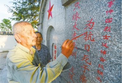 2025年5月12日,陈金国在老伴的陪伴下,给杜崇杰烈士墓碑描字。