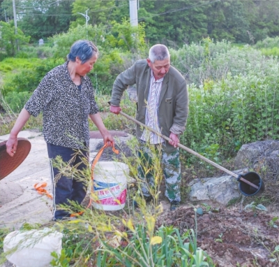 2025年5月12日,陈金国和老伴在地里浇水。