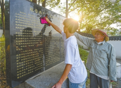 2025年5月25日,小孙子陈世博在陈金国的带领下擦拭烈士纪念碑。