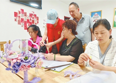 活动现场精心布置成雅致工坊:原木案几上陈列着仿古绢面竹骨团扇胚,各色扭扭棒原料依“青、赤、黄、白、紫”五正色有序摆放,宛如一幅展开的古典色谱。在巾帼志愿者项老师细心指导下,传统文化爱好者们巧手翻飞间,一根根扭扭棒被赋予新的生命——或弯曲成牡丹的雍容华贵,或缠绕出绣球的团簇生姿,再点缀以珍珠、丝带等元素,方寸扇面顿时流光溢彩。