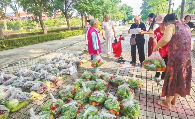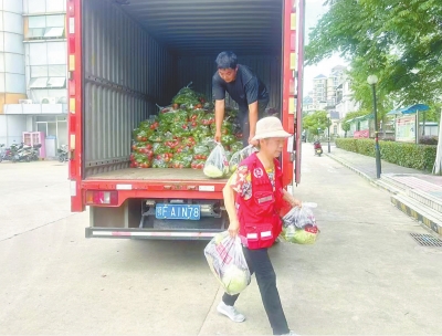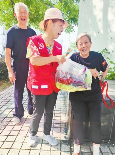 志愿者将蔬果送到行动不便的居民手中。