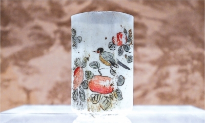 这是展出的淄博陶瓷琉璃博物馆藏清代白底烤花八棱琉璃笔筒。