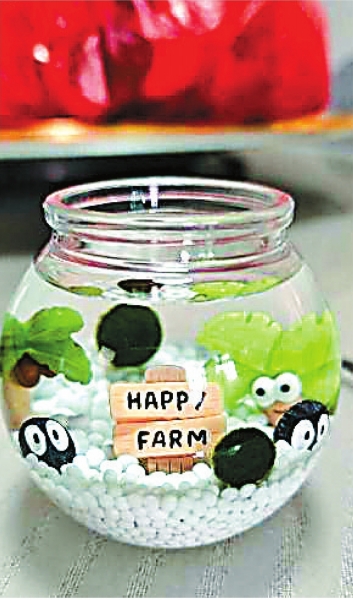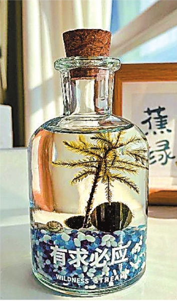 不经意间,她路过一家花店,橱窗里星星点点的绿光突然吸引了她的目光。凑近一看,一个个圆润的绿色球体安静地躺在透明玻璃容器里,随着水流轻轻晃动,像是被封印在水晶球里的小精灵,周楠鬼使神差地买下了其中一颗,还特意挑选了带鹅卵石和小贝壳装饰的玻璃罐。