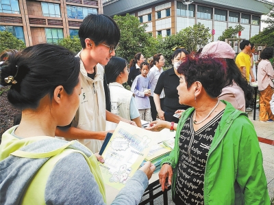 高校大学生志愿者进社区,为居民介绍健康饮食。
