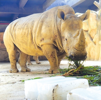白犀牛的内展馆放置了冰块。