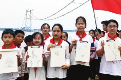 小学生展示自己在湿地观察各种鸟类的写生。