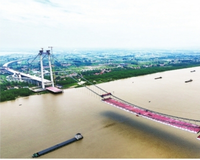 6月28日,双柳长江大桥进入钢梁施工阶段,远处就是涨渡湿地自然保护区。
