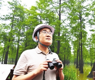6月24日,彭晓彬在涨渡湖湿地观察鸟类生存状况。